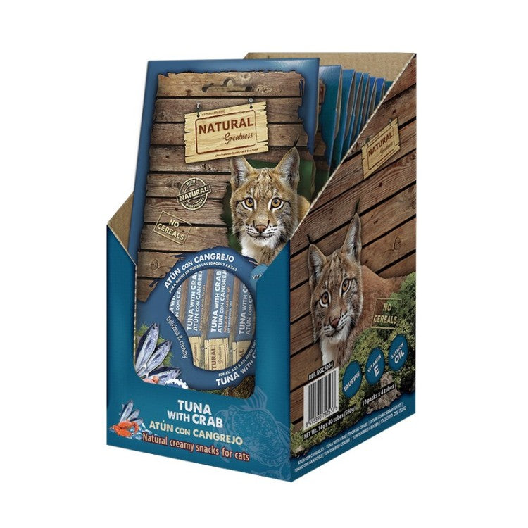 Alimento complementario para gatos a partir de dos meses. Natural Greatness Crema de atún con cangrejo es un suave y cremoso snack elaborado sin cereales que incluye atún y cangrejo de primera calidad y está enriquecido con taurina, vitamina E y aceite de salmón para ayudar a que el gato mantenga una piel saludable y un pelaje sedoso y brillante.