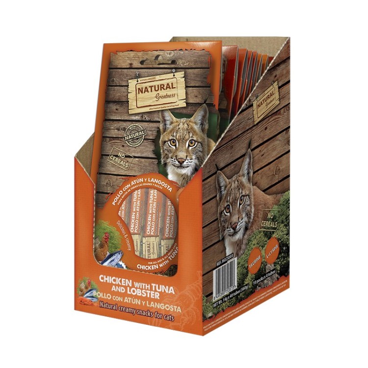 Alimento complementario para gatos a partir de dos meses. Natural Greatness Crema de pollo con atún y langosta es un suave y cremoso snack elaborado sin cereales a partir de carne de pollo, atún y langosta de primera calidad y enriquecido con taurina y L-lisina, un aminoácido esencial que promueve el buen funcionamiento del sistema inmunitario del gato.