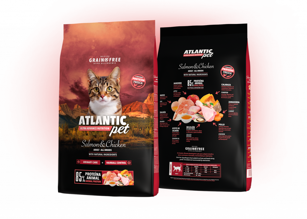 Salmon & Chicken es un alimento hipoalergénico diseñado para el bienestar de tu gato. Con un 85% de proteína animal, su receta con pollo, salmón, calabaza y superalimentos ayuda a mantener la salud urinaria y a reducir la formación de bolas de pelo.